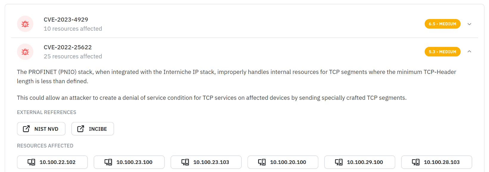 • For each device, you can view its metadata, such as name, IP address, and firmware version, to understand the scope of the vulnerability.